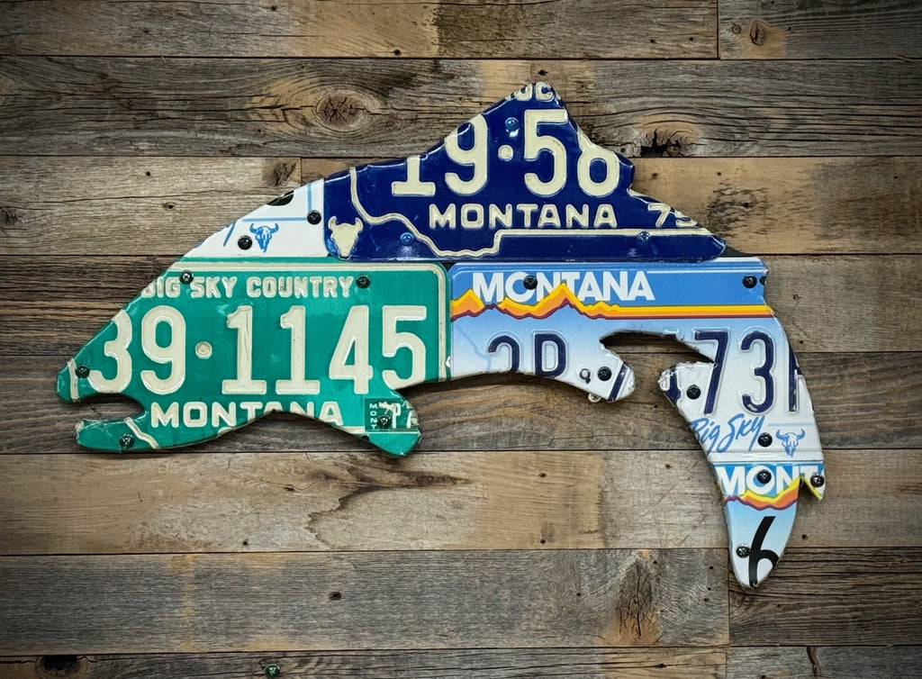 Every size of a fish is a winner!  By popular request, is our 24" Montana Trout with a mix of license plates over the years.  Every license plate art piece is handmade and unique. Yours will look very similar but will not be exactly the same as the photo example with a mix of nostalgic Wyoming plates.