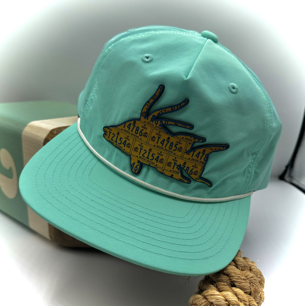 Capture the vivid yellow Grand Bahama license plates and cool caribbean blue waters with this Bahamas Hogfish piece.  This hat is printed on a variety of Richardson and Pacific snap-back mesh hats and comfort foamies to fit your individual needs.  These feature a made-in-USA patch with vibrant license plates on the brow!  These hats will keep you stylish and cool while in the sun playing, or in the shade with a rum drink in hand.