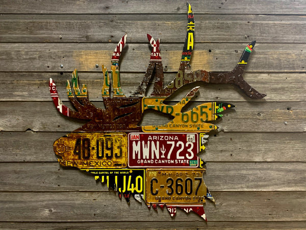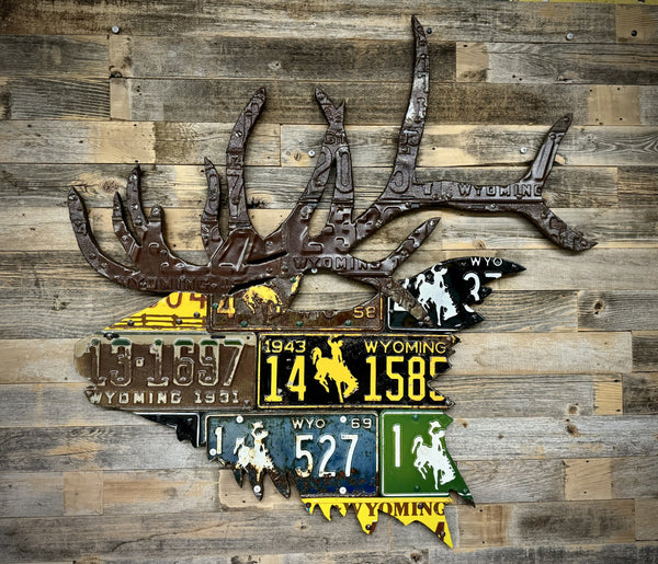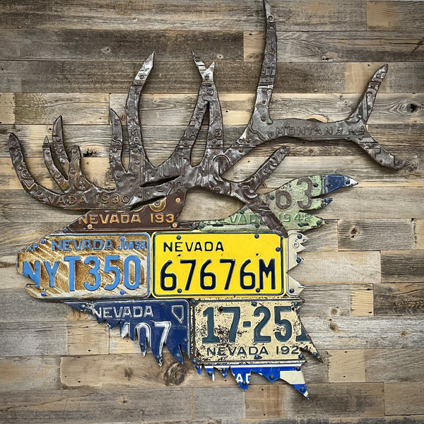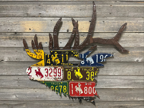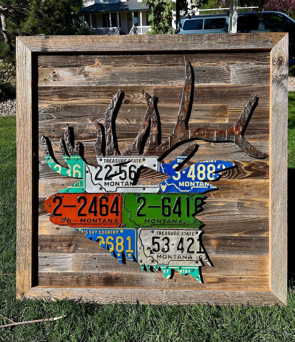 Celebrate the beauty and challenge of these beautiful elk. Authentic license plates are ornately wrapped around solid wood backing with a protective clearcoat for durability indoors or out.