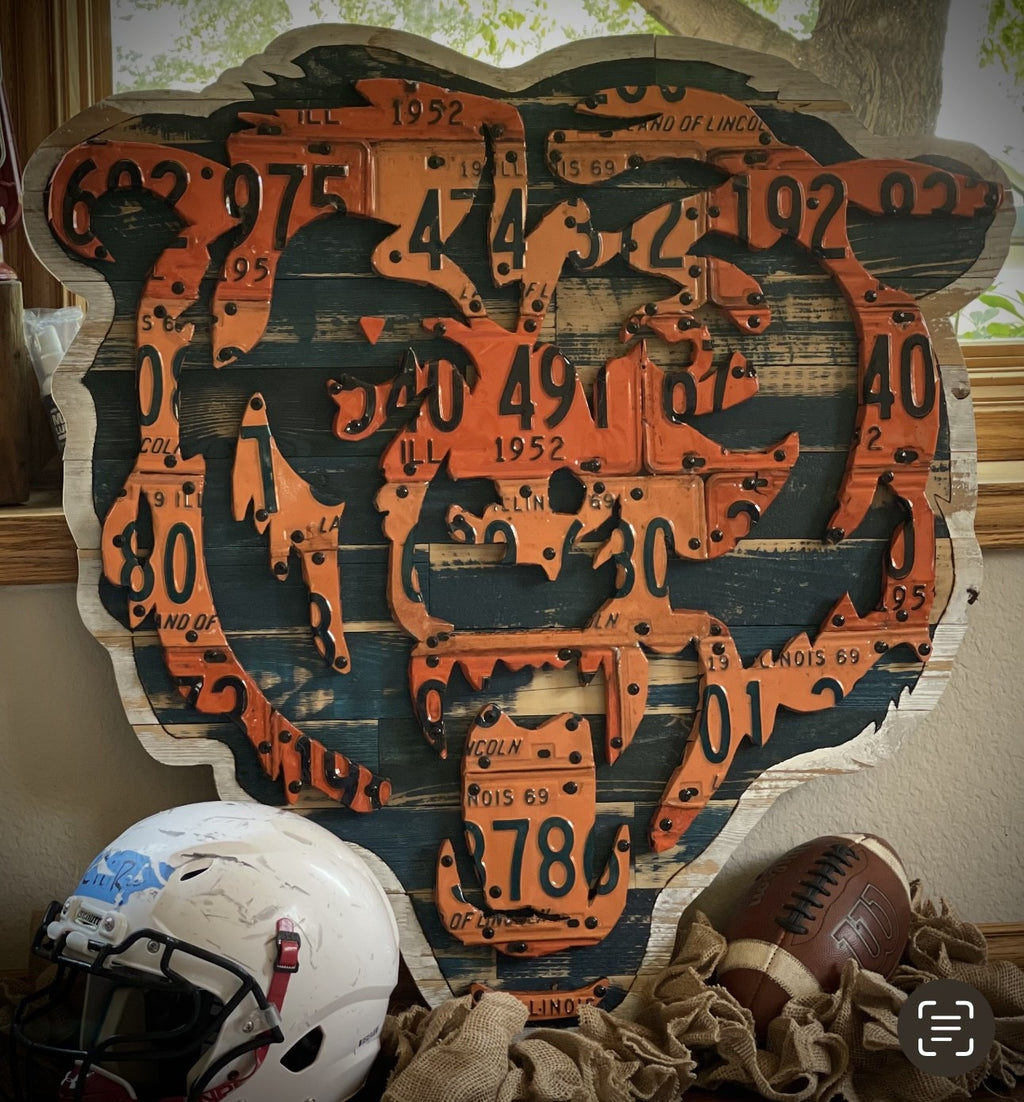 When you want something to take your walls to the next level, show your Chicago Bears pride with this large piece of artwork.  All authentic license plates are from Illinois in multi-layers over a blue barnwood stained backing.
