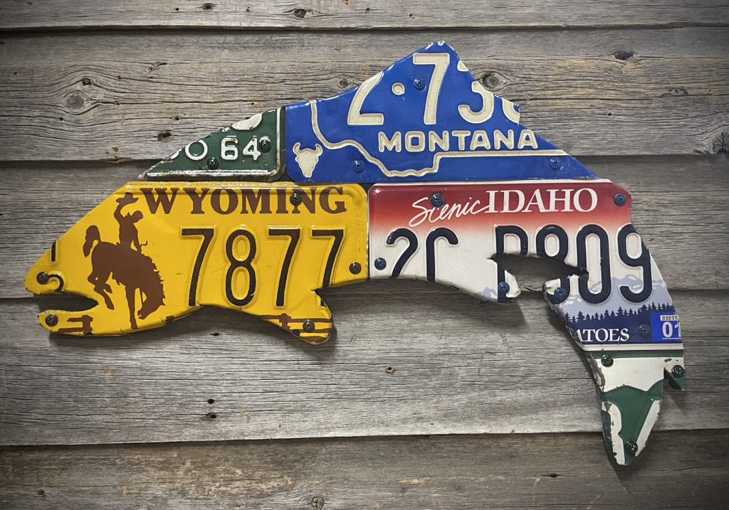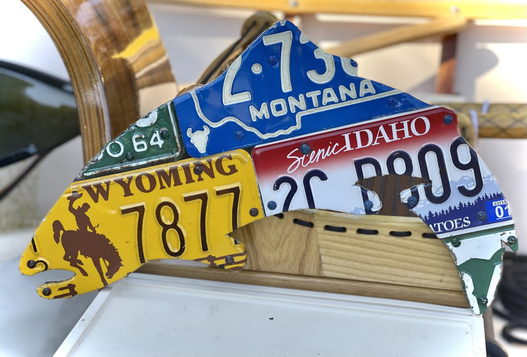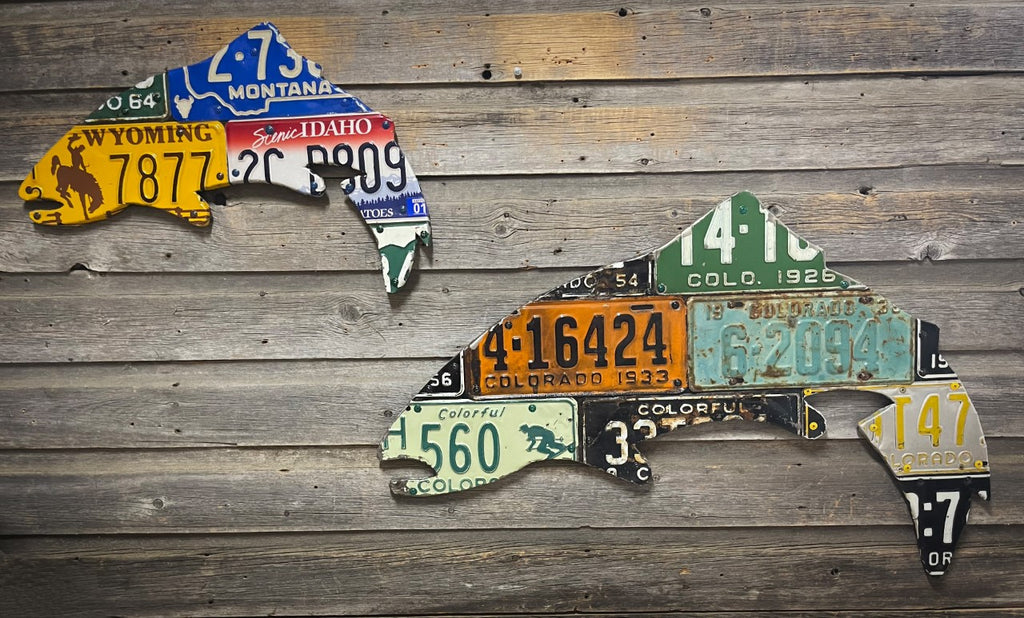 Every size of a fish is a winner! By popular request is our 24" Mixed Western Trout. Every license plate art piece is handmade and unique. Yours will look very similar but will not be exactly the same as the photo example with a mix of ID, MT, CO, WY, and/or UT plates.