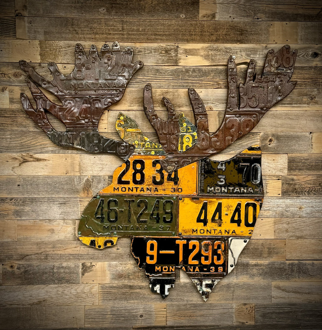 Bring this fun piece to your home. Moose are made with antique Montana license plates with antlers made of aged plates to bring these pieces to life. Every license plate art piece is handmade and is unique. Yours will look very similar but will not be exactly the same as the photo example.