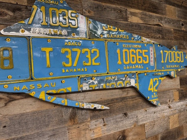 When you chase sailfish, you need a stunning piece of artwork for your walls.  This large 70" Bahamas art piece is a true original using only decommissioned plates that have bumped around on cars all over the islands, telling of some great stories.  Every license plate art piece is handmade and is unique. Yours will look very similar but will not be exactly the same as the photo example.