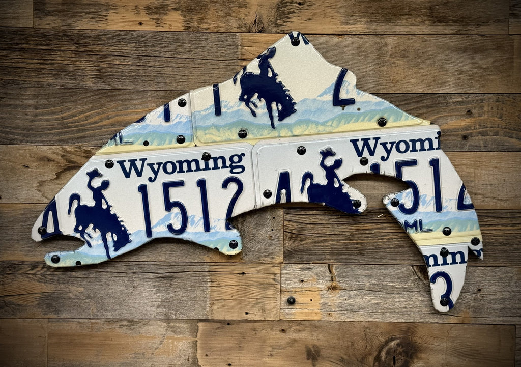 Ride along with the nostalgic Wyoming cowboy and his trusted bronc Steamboat in this cool art piece featuring the beautiful Wyoming mountains and prairies. This piece has all blue Wyoming license plates similar to the piece below. Every license plate art piece is handmade and unique. Yours will look very similar but will not be exactly the same as the photo example with a mix of nostalgic Wyoming plates.